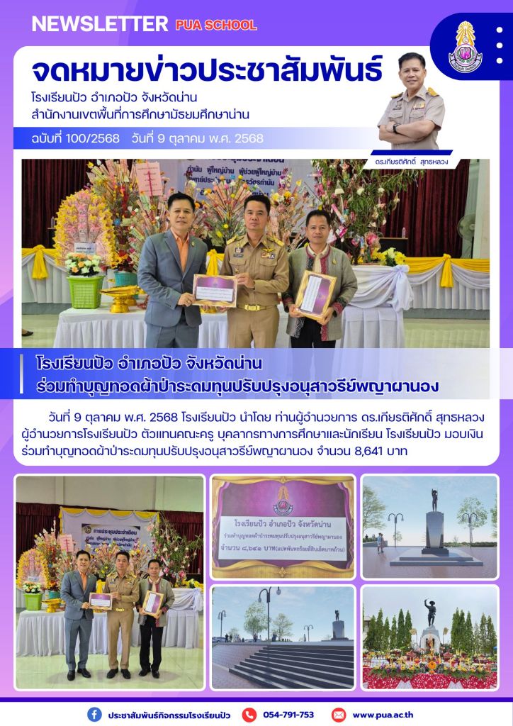วันที่ 9 ตุลาคม พ.ศ. 2568 โรงเรียนปัว นำโดย ท่านผู้อำนวยการ ดร.เกียรติศักดิ์ สุทธหลวง ผู้อำนวยการโรงเรียนปัว ตัวแทนคณะครู บุคลากรทางการศึกษาและนักเรียน โรงเรียนปัว มอบเงินร่วมทำบุญทอดผ้าป่าระดมทุนปรับปรุงอนุสาวรีย์พญาผานอง จำนวน 8,641 บาท