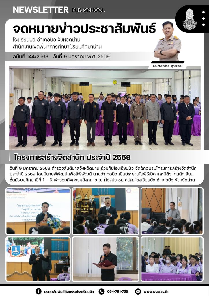 วันที่ 9 มกราคม 2569 ตำรวจสันติบาลจังหวัดน่าน ร่วมกับโรงเรียนปัว จัดฝึกอบรมโครงการสร้างจิตสำนึก ประจำปี 2569 โดยมีนายพิพัฒน์ เพ็ชร์พิพัฒน์ นายอำเภอปัว เป็นประธานในพิธีเปิด และมีตัวแทนนักเรียนชั้นมัธยมศึกษาปีที่ 1 – 6 เข้าร่วมกิจกรรมดังกล่าว ณ ห้องประชุม สปค. โรงเรียนปัว อำเภอปัว จังหวัดน่าน
