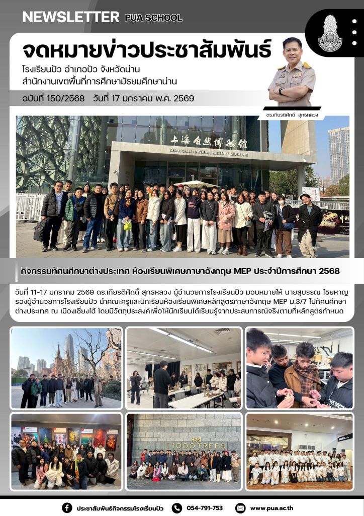 วันที่ 11-17 มกราคม 2569 ดร.เกียรติศักดิ์ สุทธหลวง ผู้อำนวยการโรงเรียนปัว มอบหมายให้ นายสุบรรณ ไชยหาญ รองผู้อำนวยการโรงเรียนปัว นำคณะครูและนักเรียนห้องเรียนพิเศษหลักสูตรภาษาอังกฤษ MEP ม.3/7 ไปทัศนศึกษาต่างประเทศ ณ เมืองเซี่ยงไฮ้ โดยมีวัตถุประสงค์เพื่อให้นักเรียนได้เรียนรู้จากประสบการณ์จริงตามที่หลักสูตรกำหนด