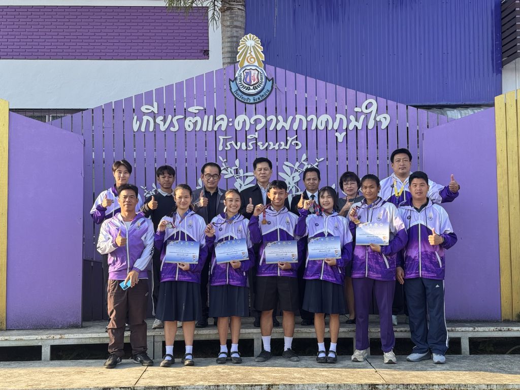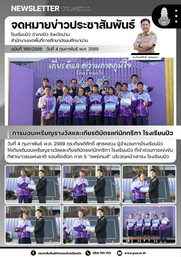 วันที่ 4 กุมภาพันธ์ พ.ศ. 2569 ดร.เกียรติศักดิ์ สุทธหลวง ผู้อำนวยการโรงเรียนปัว ให้เกียรติมอบเหรียญรางวัลและเกียรติบัตรแก่นักกรีฑา โรงเรียนปัว ที่เข้าร่วมการแข่งขันกีฬาเยาวชนแห่งชาติ รอบคัดเลือก ภาค 5 “แพร่เกมส์” บริเวณหน้าเสาธง โรงเรียนปัว
