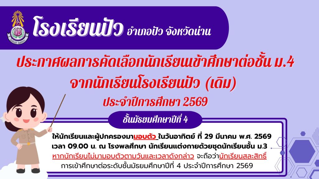 🔊ประกาศโรงเรียนปัว เรื่อง ผลการคัดเลือกนักเรียนเข้าศึกษาต่อระดับชั้นมัธยมศึกษาปีที่ 4