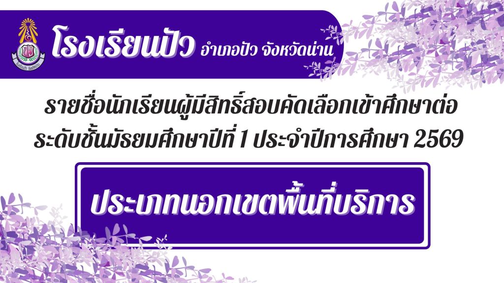 🔊ประกาศโรงเรียนปัว เรื่อง รายชื่อนักเรียนผู้มีสิทธิ์สอบคัดเลือกเข้าศึกษาต่อระดับชั้นมัธยมศึกษาปีที่ 1 ประจำปีการศึกษา 2569 ประเภทนอกเขตพื้นที่บริการ