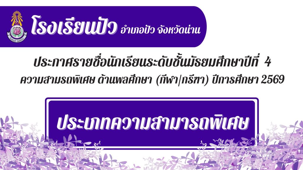 🔊ประกาศโรงเรียนปัว เรื่อง รายชื่อนักเรียนระดับชั้นมัธยมศึกษาปีที่ 4 ประเภทความสามารถพิเศษ ด้านพลศึกษา (กีฬา/กรีฑา) ประจำปีการศึกษา 2569